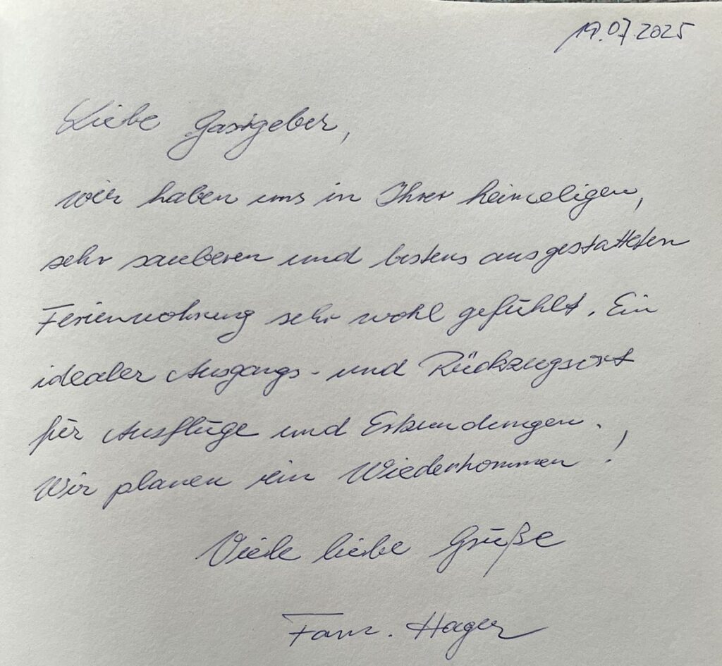Im letzten Sommer verbrachten wir zwei wunderschöne Wochen in Ihrer Ferienwohnung. Die Ausstattung war einfach Spitze und hat alles bisherige voll übertroffen. Alles was man benötigte für den täglichen Bedarf war vorhanden, obwohl wir ja den ganzen Tag außer Haus waren und eigentlich nicht viel da…, denn wir erkundeten alles, was im Umfeld von 200 Km zu sehen war.